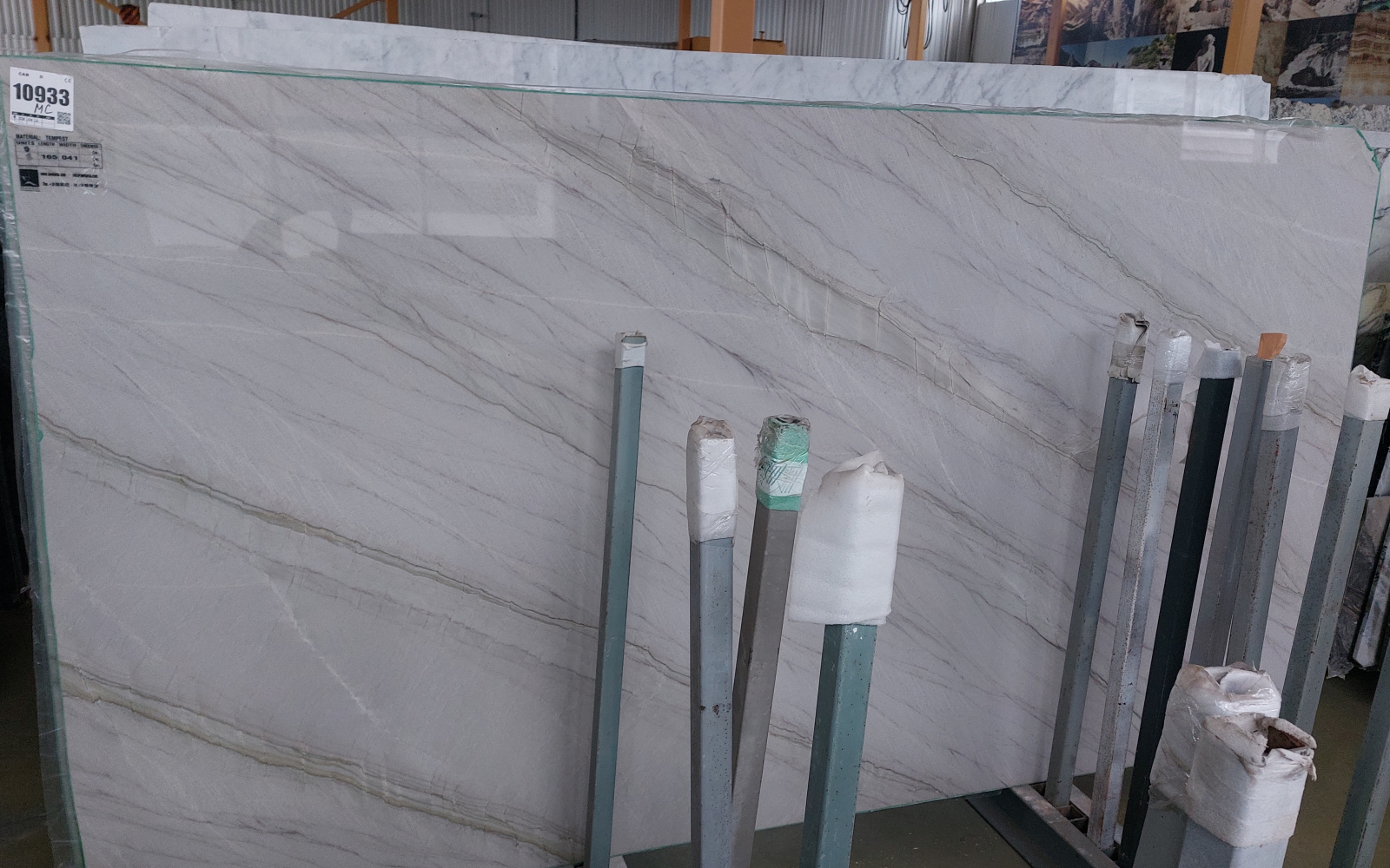 Светлый бразильский кварцит Tempest (Темпест) поступил на склад в декабре 2025 года. Качество материала превосходное, камень имеет глянцевую, полированную поверхность. Оттенки камня - скорее серый, с тонкими темными прожилками. Кварцит - камень прочный, плотный, устойчивый к механическим и химическим воздействиям (не царапается, на нём не остаются пятна). Кварцит Темпест - отличный выбор для изготовления кухонной столешницы!