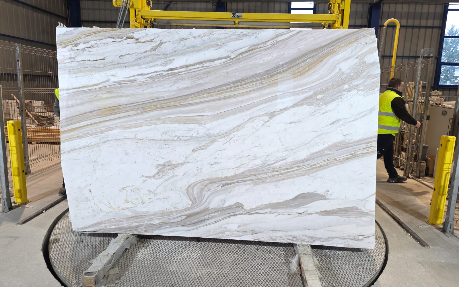 Греческий мрамор Волакас отлично подходит для внутренней отделки помещений - облицовки стен, каминов, пола, ванных комнат, лестниц. Диагональная нежная серо-бежевая жилка делает этот камень привлекательным, такой узор создает эффект движения и легкости. Полированные слэбы толщиной 2см ждем поставку в начале апреля 2026г.